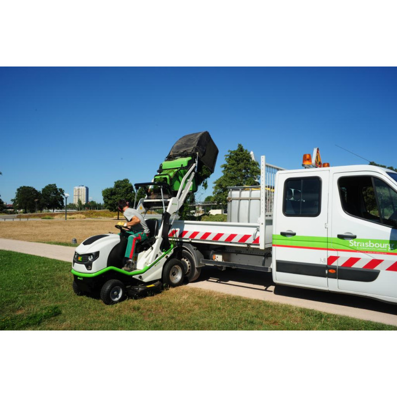 Profesionálný traktorová sekačka trávy ETESIA Buffalo 124 HVHPX2 s pohonem kol 4x4, se záběrem 124 cm, vysypáváním koše do výšky 180 cm a s motorem o výkonu 23 HP zvládne efektivně posekat až 15 000 m2/hoh.